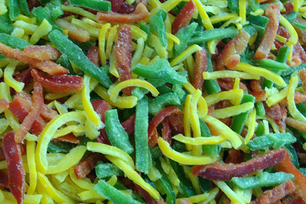 Onion strips, garlic sprout, carrot strips, cut beans.